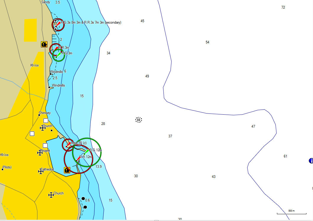 Outer anchorage: The anchorage off Chios extends from 0.5nm S to 2nm N the harbor entrance. For a distance of approx 4nm N of the harbor entrance, the coast is fringed by a narrow bank, but the bottom falls away steeply and at the distance of approx 0.3nm from the shore the depths are considerable. The recommended anchorage is approx 1nm NE of the citadel, in depths of 22.0-33m, mud. It is possible to anchor nearer the harbor, but here the bottom consists of soft mud and the holding is not so good.