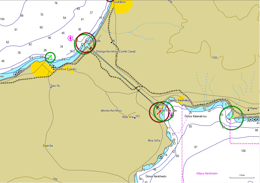 Anchorages: Temporary anchorage for vessels waiting to enter the canal at Poseidonia is available in approx 29m, grey mud, between the canal entrance and Corinth, but clear of traffic using the canal entrance. Anchorage is prohibited N of the canal entrance in an area extending 1nm offshore in which there are submarine cables.